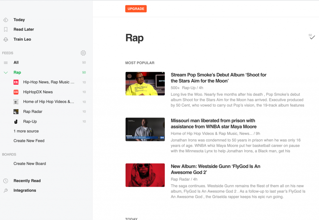 You can connect your Feedly and Google accounts to Feedly. Once your account is created, explore the interface. There are several options/paid versions but this activity will only require the free version. Let’s take the example of rap and say you are passionate about this genre and are doing a research project on it. Create an information thread (‘feed’) and a board. Here are some organisational tips: